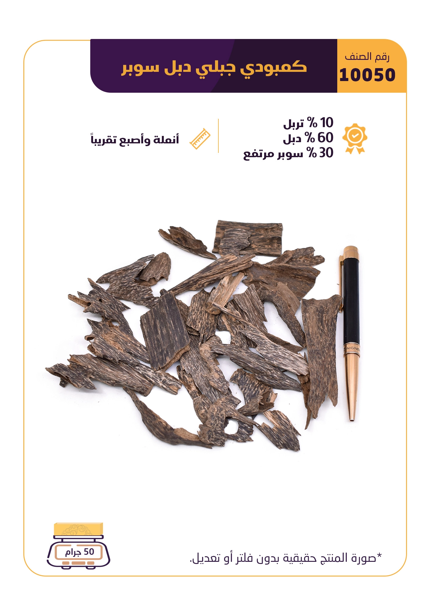 تمتزج فيها نفحات الزعفران الدافئة، فتمنحه طابعًا ملكيًا فاخرًا يأخذك هذا العود في رحلةٍ تتماوج بين برودة العود الكمبودي ورقّة النكهة الزعفرانية، ليترك أثرًا عطريًا آسِرًا يدوم طويلًا،